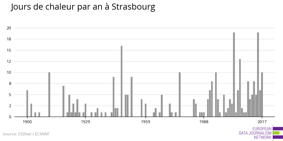 Le réchauffement climatique, c’est maintenant ! Depuis 1900, la température moyenne à Strasbourg a augmenté de 0,9°C : elle s’établissait à 9,4°C entre 1900 et l’an 1999 pour atteindre 10,5°C entre l’an 2000 et 2017. Ce résultat est issu d’une enquête de l’European Data Journalism Network, dont Rue89 Strasbourg est partenaire, à partir des données du Centre Européen pour les Prévisions Météorologiques dans plusieurs centaines de villes du continent, dont une cinquantaine en France.