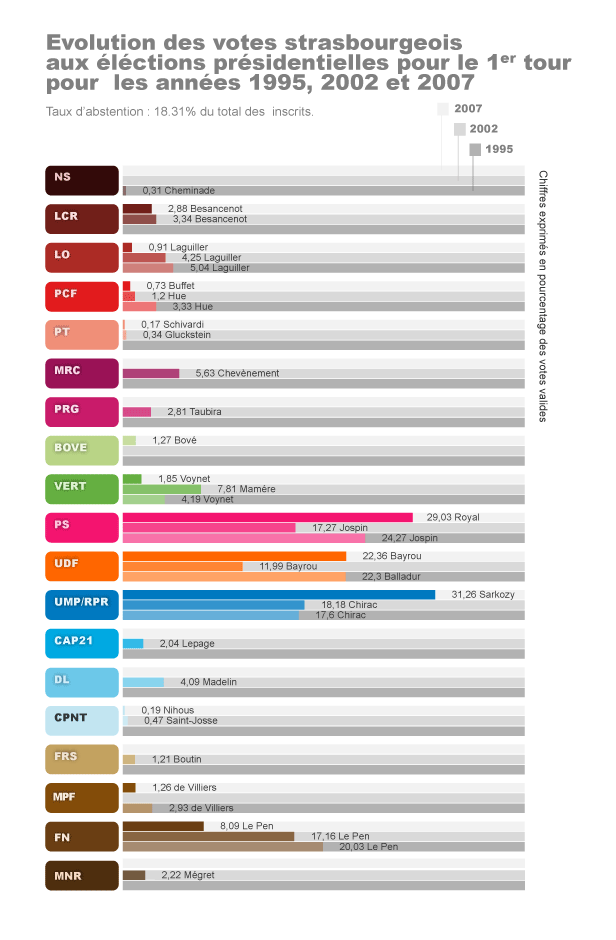 Sarkozy, Royal, Bayrou : en 2007, l’ordre d’arrivée des grands candidats au premier tour à Strasbourg correspondait aux résultats nationaux. Les Strasbourgeois ont toutefois plus voté pour François Bayrou que les Français (22,36% contre 18,57%) et moins pour Jean-Marie Le Pen (8,09% contre 10,44%).