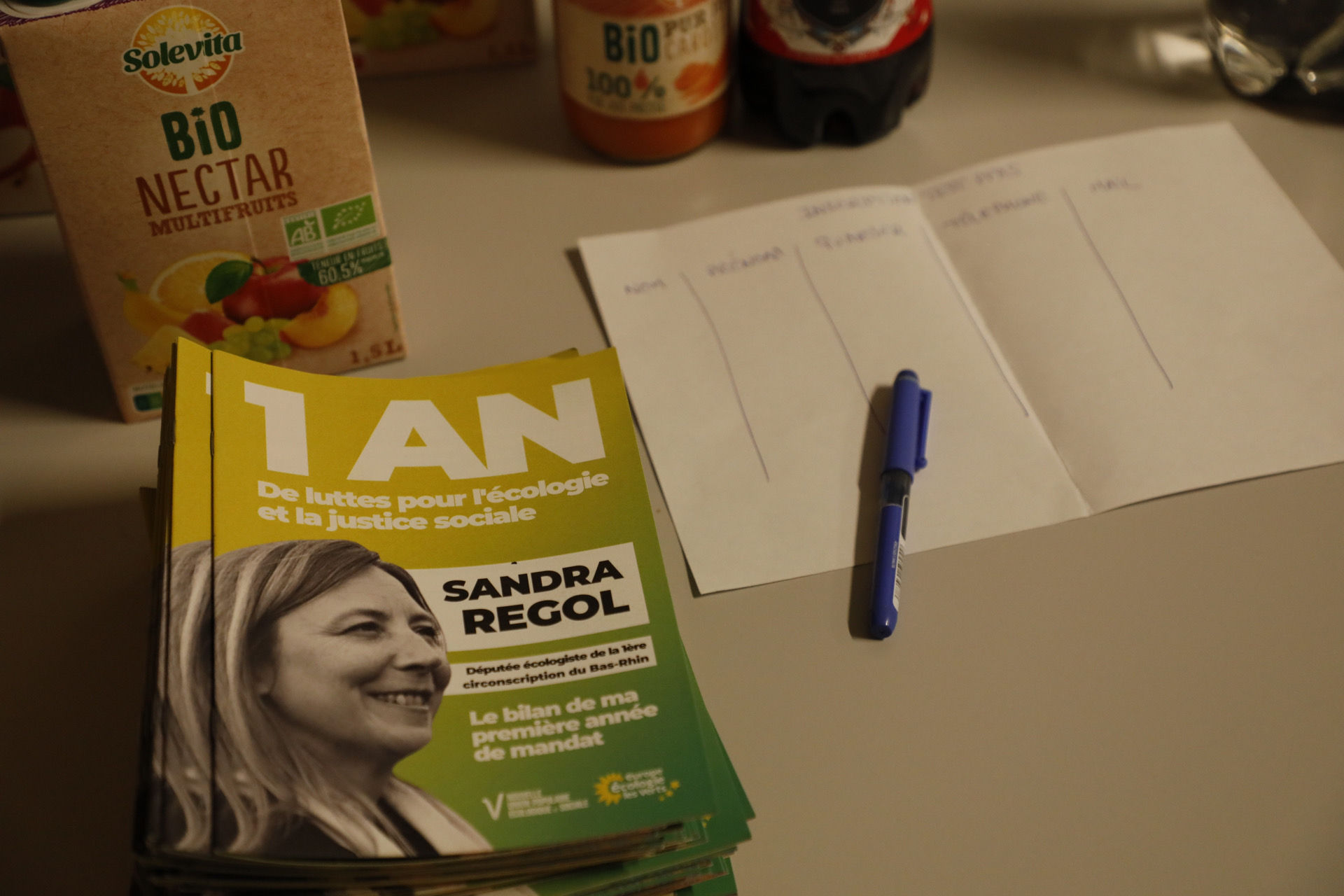 À ses côtés, les deux membres des Jeunes écologistes d’Alsace semblent fiers de leurs nouvelles informations. Élodie, 21 ans, fait le tour des notes prises sur son téléphone :
