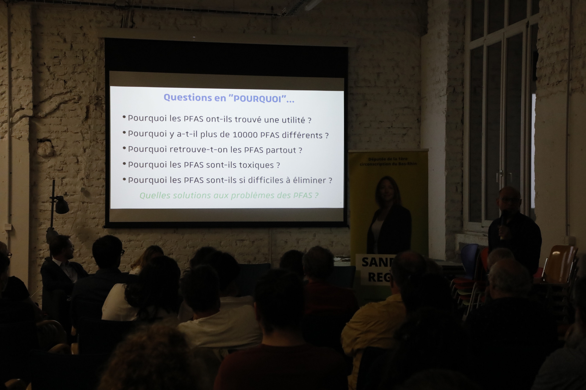 La lumière de la salle au parquet sombre ne cesse de clignoter. L’ambiance se fait plus solennelle alors que la seconde partie de la soirée, centrée sur les pollutions de l’eau l’industrie via les composés perfluoroalkylés et polyfluoroalkylés (PFAS), autrement appelés « polluants éternels », commence. Pour introduire le sujet, Sandra Regol annonce qu’elle financera dix tests pour que des Strasbourgeois fassent détecter la présence de ces polluants dans leurs cheveux. « Nous sommes plusieurs à l’Assemblée à avoir fait le test et nous avons tous des polluants éternels en nous », poursuit-elle.