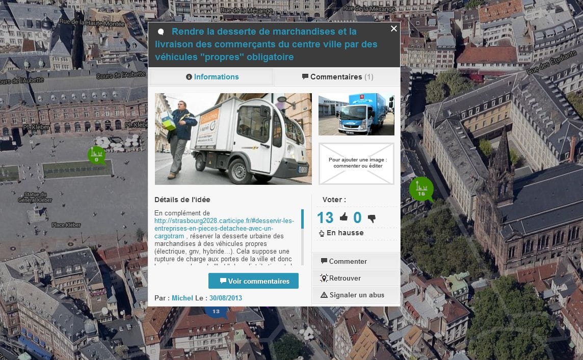 Pour l’instant, la grande majorité des suggestions postées disposent d’un large solde de votes positifs. Mais quelques idées sont très débattues, comme la création d’une tour de 100 mètres (33 votes pour, 14 contre et 10 commentaires). Quant à la tour Valentin Sorg (à côté de l’Homme-de-fer), elle est l’objet de deux débats contradictoires : les uns veulent la détruire, les autres proposent de la végétaliser.
