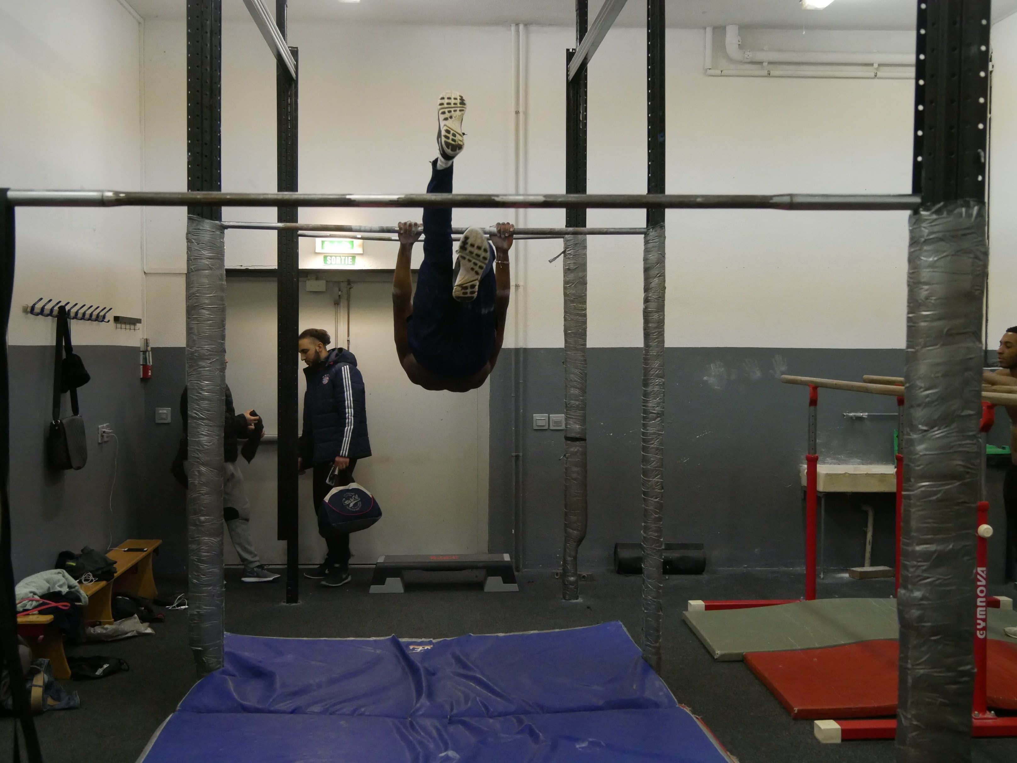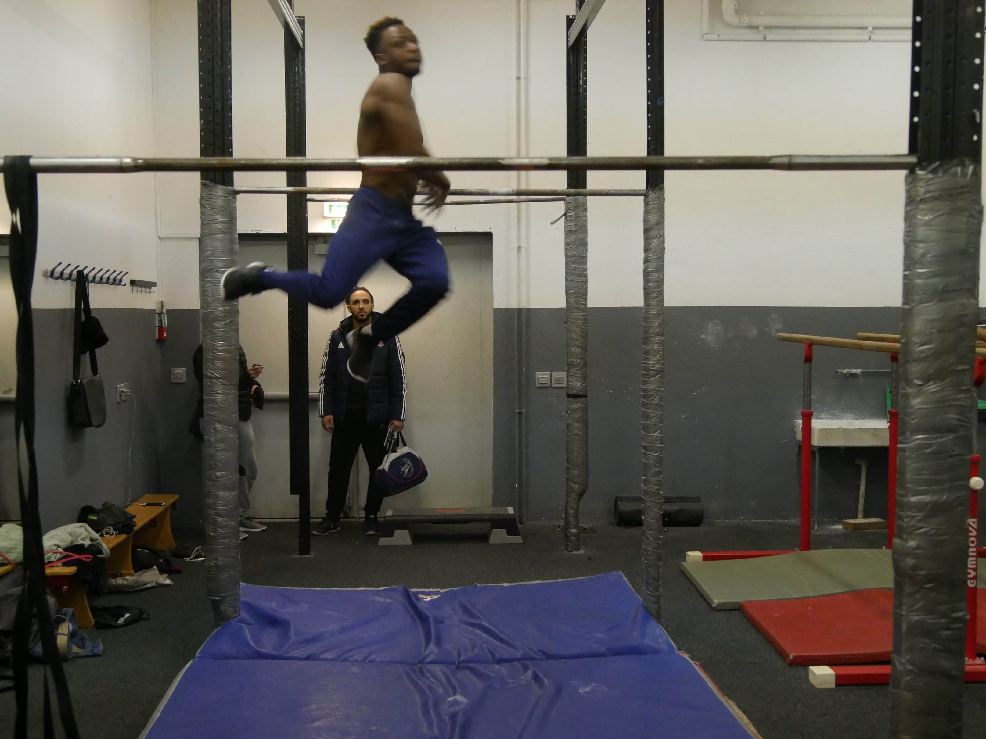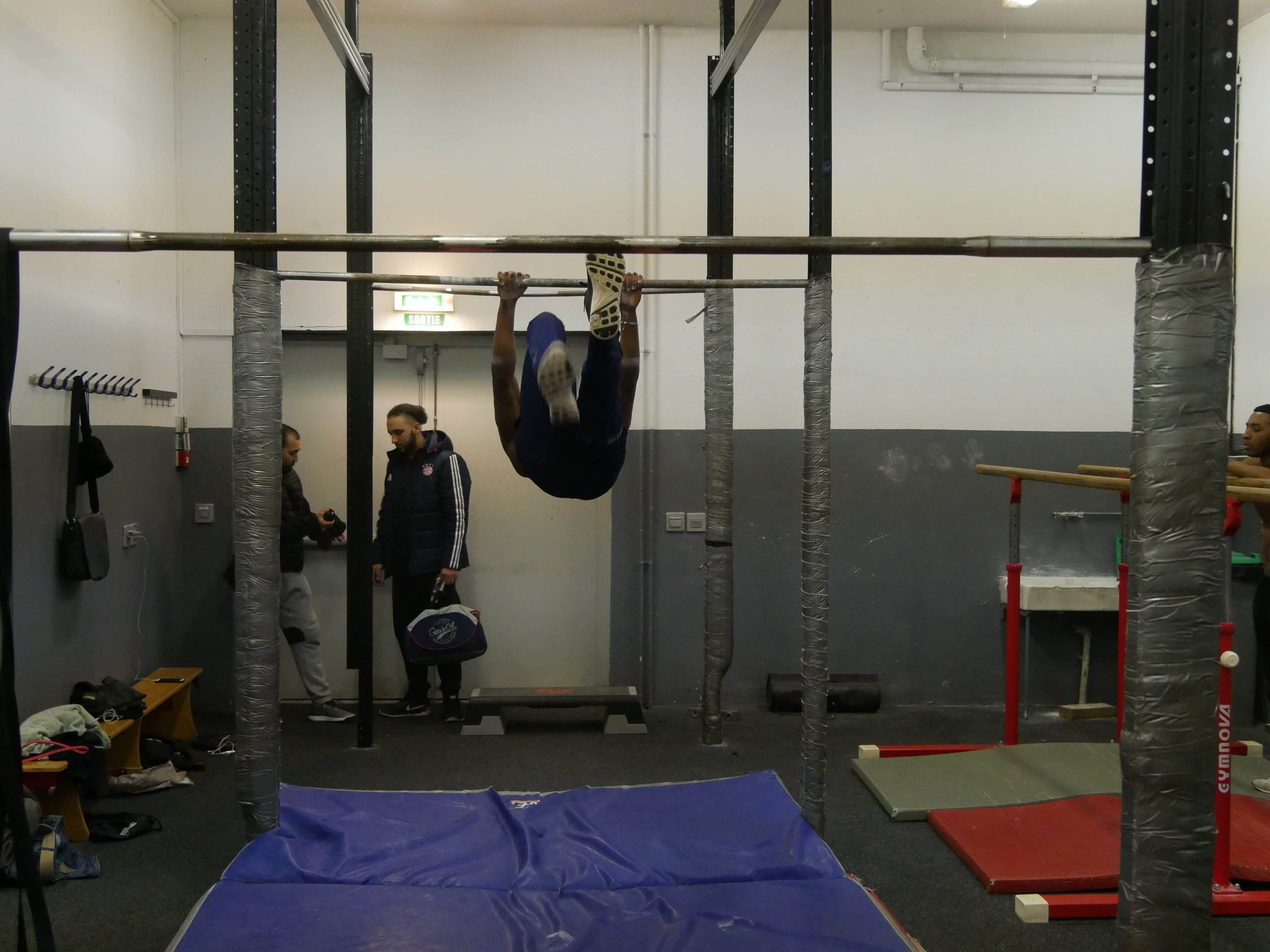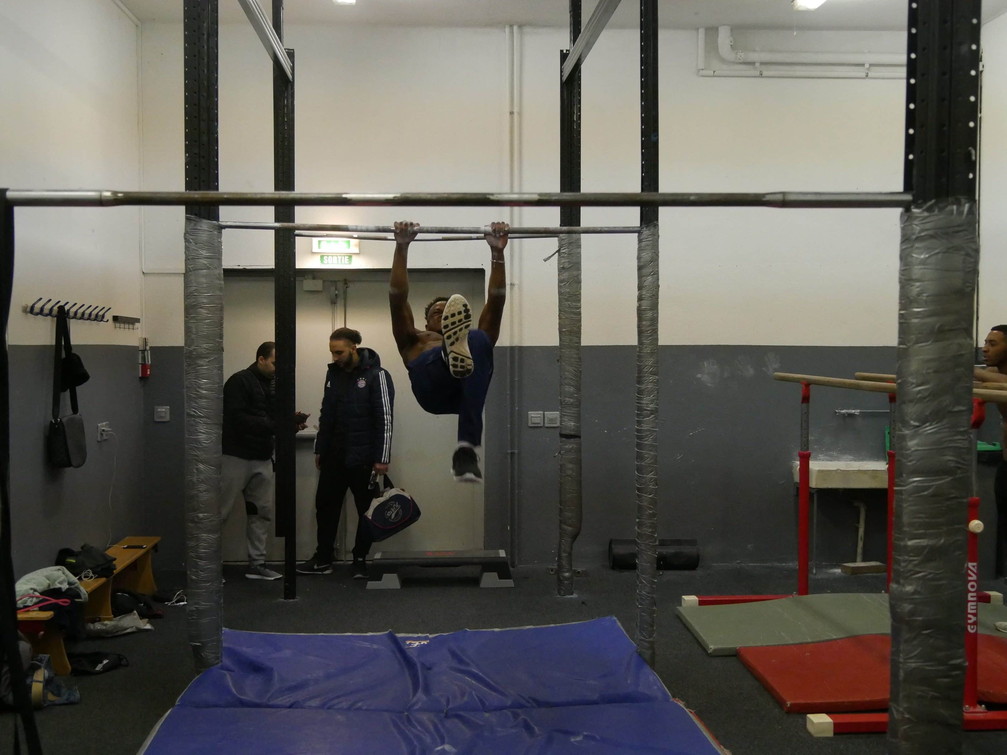 Il ne faut pas demander deux fois à Kévin de s’exécuter. Sur les barres parallèles, il enchaîne les poiriers. Sur une structure métallique à proximité, il se stabilise à l’horizontal à la force d’un seul bras. Ses potes de la salle sifflent pour exprimer leur approbation face à un geste technique.