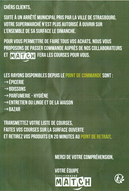 Dans ces conditions, le supermarché Match du quartier de la Robertsau, offrant une surface de 1 963 m², ne peut plus ouvrir les dimanches matins, comme il en avait pris l’habitude depuis septembre. Pourtant , le magasin a bel et bien ouvert dimanche 8 janvier de 9h à 12h.