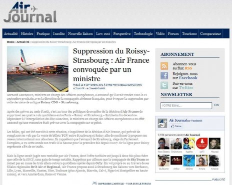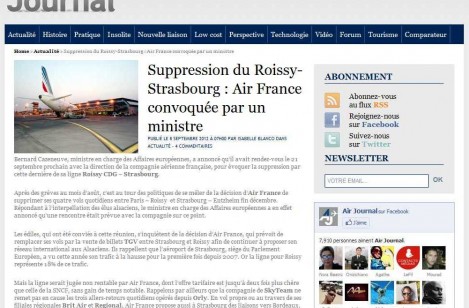 Selon Air Journal, le ministre en charge des Affaires européennes, Bernard Cazeneuve, a rendez-vous le 21 septembre avec la direction d’Air France pour évoquer la suppression de sa ligne Roissy CDG – Strasbourg. L’annonce de la suppression de cette liaison aérienne, pour la remplacer par le TGV, a provoqué de nombreuses réactions dans les milieux politiques et économiques, ainsi que plusieurs grèves très suivies du personnel de l’escale d’Entzheim. Pour les élus, l’abandon de cette ligne porte un grave coup à la vocation de « capitale européenne » de Strasbourg. Tandis que pour les milieux économiques, aéroport en tête, l’arrêt de ce trafic de passagers remet en cause la viabilité de la plate-forme aéroportuaire d’Entzheim.