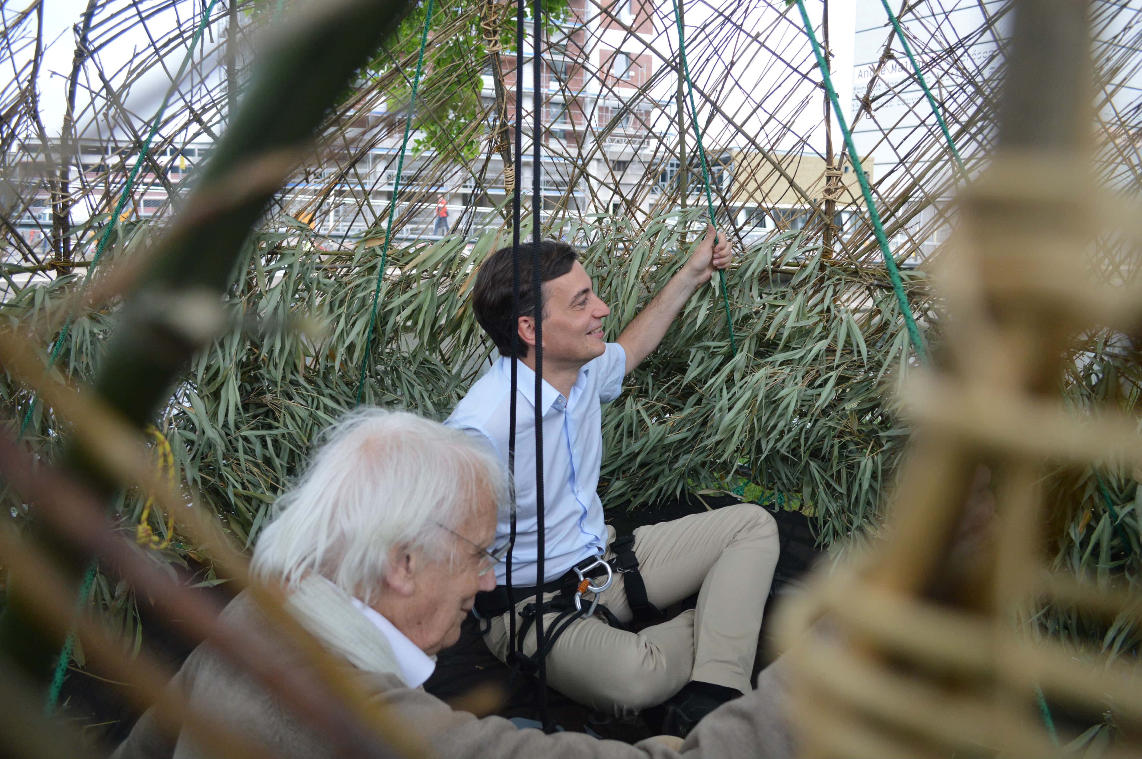 L’artiste et architecte Luc Schuiten, dont l’exposition les « Cités végétales en 2115 » est accessible au Shadok jusqu’au 7 juin, a soigné son arrivée. Conduisant un tricyclopolitain avec à son bord le premier adjoint au maire chargé de la Culture, Alain Fontanel, Luc Schuiten a du sentir vivre son utopie. Il a félicité le travail accompli par les 60 étudiants de l’école d’architecture de Strasbourg, l’ENSAS, et rappelé l’ambition de ce projet : »