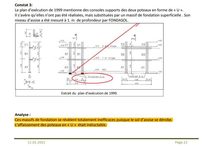 « On peut considérer que ce défaut d’exécution est le fait générateur de l’affaissement des balcons (…) L’affaissement des poteaux en « U » était inéluctable. »