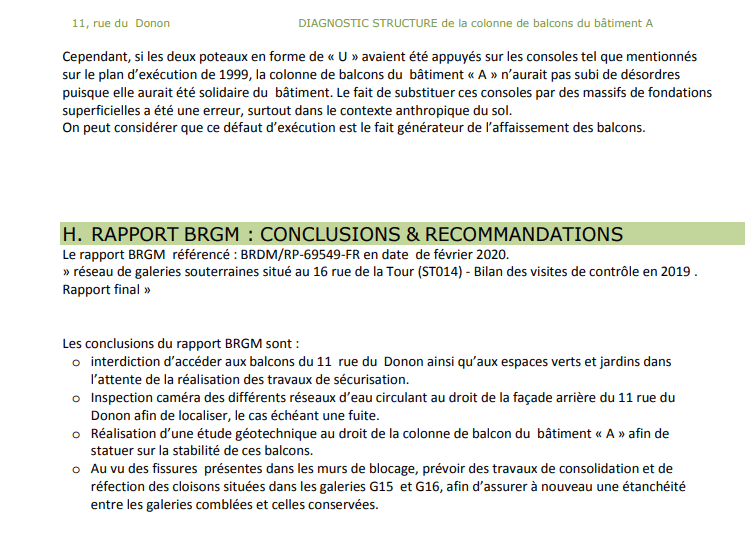 Extrait du DIAGNOSTIC STRUCTURE de la colonne de balcons du bâtiment A, par le bureau d’étude Volumes et Images