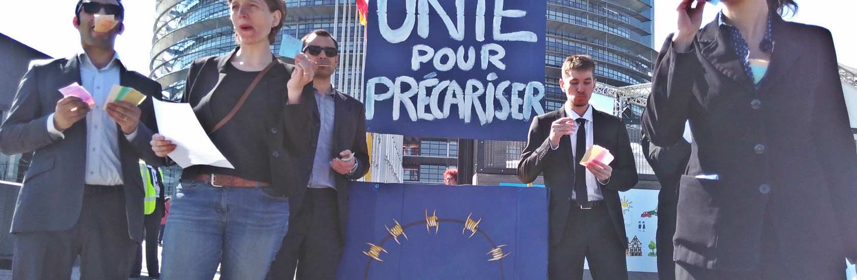Les "intermittents en lutte" de Strasbourg et des étudiants ont profité de la journée portes ouvertes du Parlement européen dimanche pour dénoncer "l'Europe de la précarité" lors d'un happening.