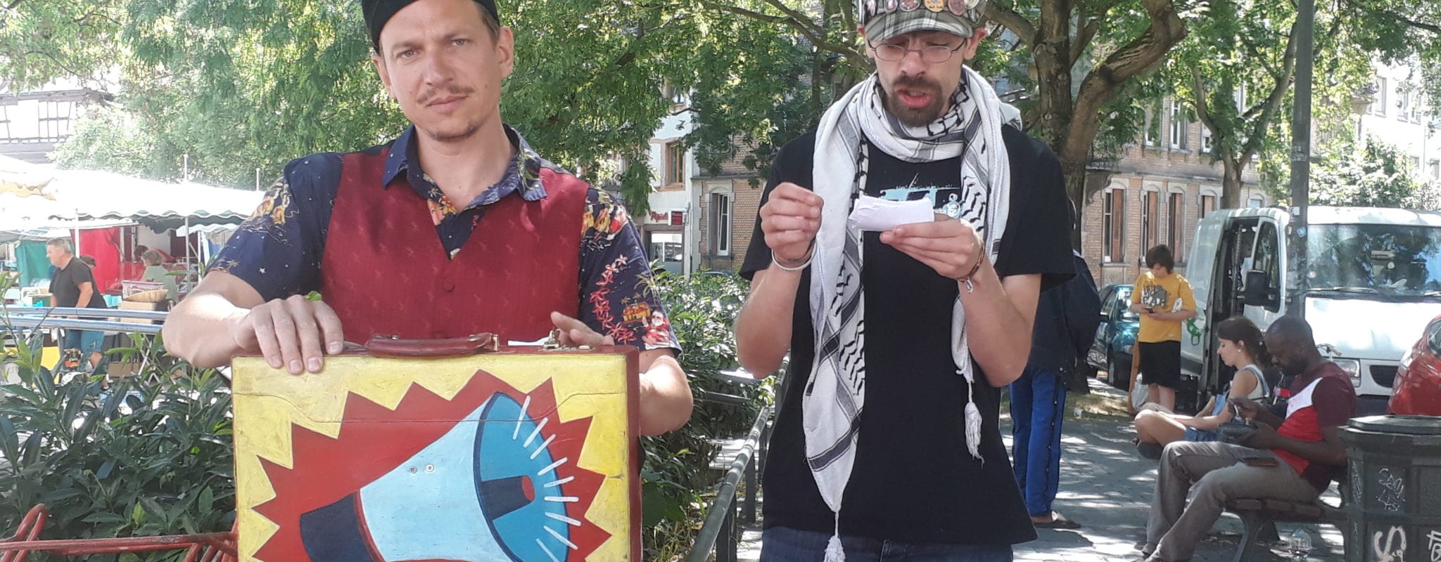 Depuis plus d'un an, Pierre le Crieur est présent lors du marché de la Krutenau. Un mercredi sur deux, il installe sa petite scène au milieu de la place de Zurich et scande haut et forts les messages que lui laissent les passants. Mais cette semaine, suite aux plaintes de quelques commerçants, il n'a pas pu prendre place au milieu des étals.