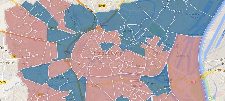 Les bureaux rose à majorité pour Roland Ries, et bleu, pour Fabienne Keller, à l'issue du second tour des élections municipales (carte Raphaël Da Silva)