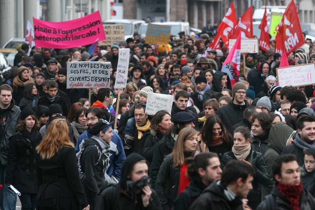 Grosse affluence malgré le froid ce samedi après-midi à Strasbourg : des représentants de tous les partis de gauche et de nombreux militants associatifs, 5000 personnes environ, se sont mobilisés pour défendre le doit au mariage pour les couples de même sexe. Rue89 Strasbourg était dans le cortège. Diaporama.