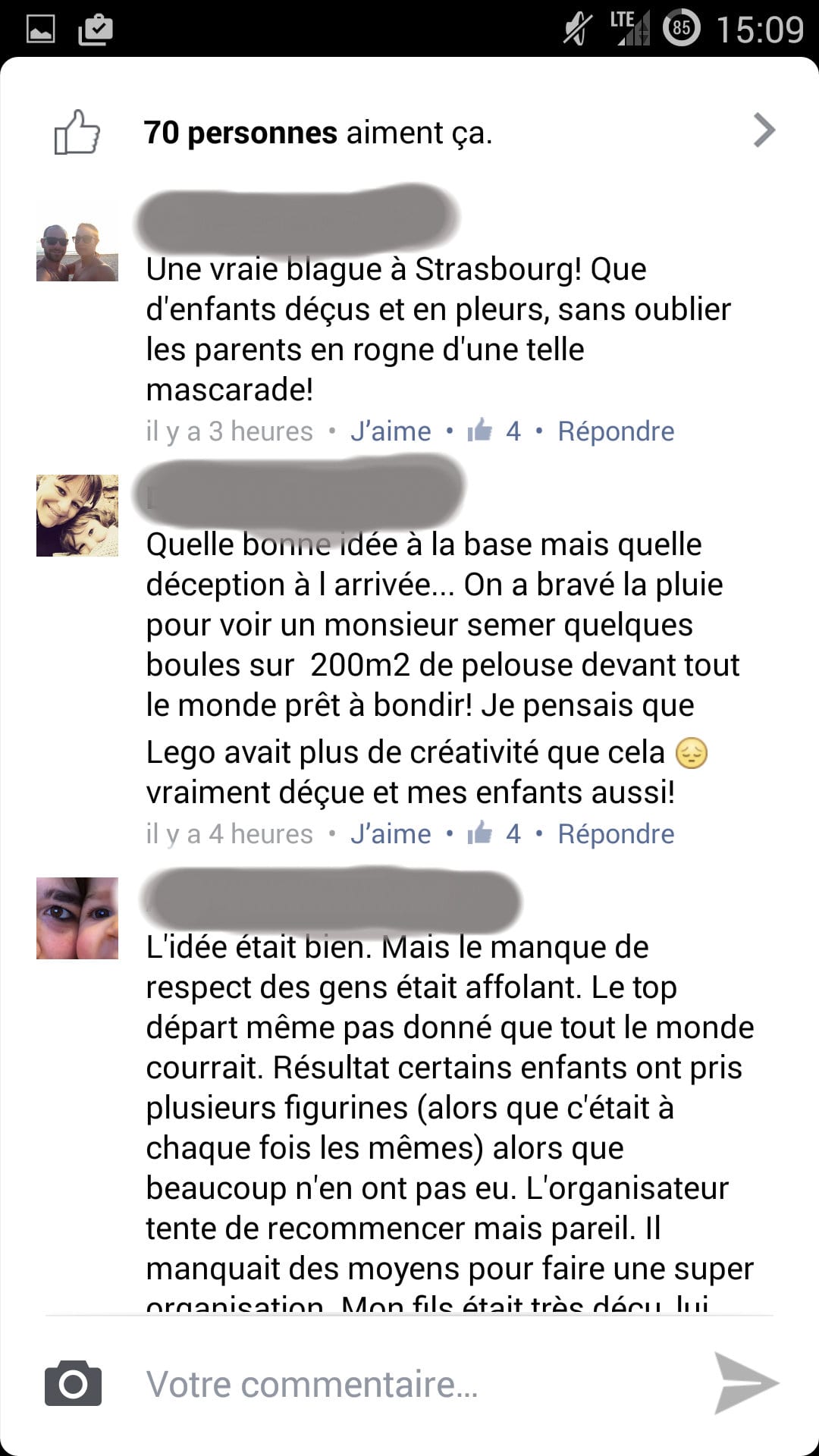 L’opération était sensée débuter à 10h pour se terminer à 13h. Comment les organisateurs pouvaient ils espérer satisfaire les gens qui répondraient à leur appel, si à 10h10 tout était déjà terminé ? C’est bien dommage, car il y avait d’autres façons de procéder. L’image plutôt sympathique que renvoie Lego est sérieusement écornée par ce genre d’attitude. Nous avons été piégés, comme 90 % des personnes présentes. »