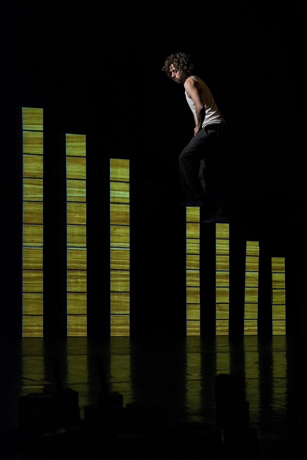 « Il a commencé par apprendre l’équilibre sur fil de fer. Il s’est ensuite déporté de cet agrès pour inventer un langage particulier : l’équilibre sur cubes de bois. Il est ainsi devenu un équilibriste précieux et unique. Il a fait le tour du monde avec son numéro du Bonhomme. Tesseract est né de là. Le spectacle va plus loin que la pure pratique de l’équilibre : c’est aussi le parcours intérieur de l’homme de la naissance à la mort. Le spectacle est drôle, décalé, extraordinairement profond. L’équilibre est alors une métaphore de la nature humaine : c’est l’énergie qui nous pousse à tenir. »