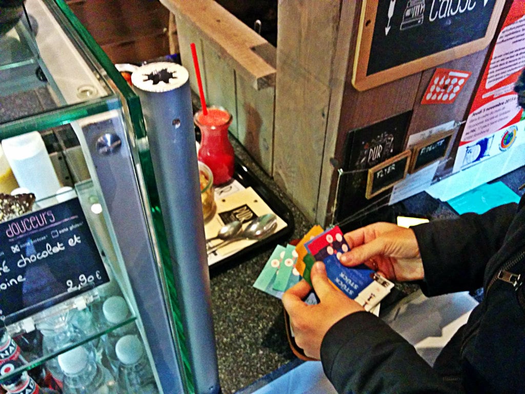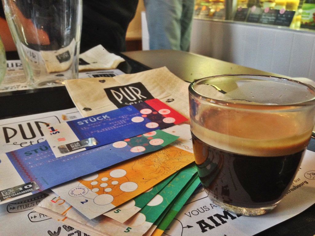 Juliette déjeune à Pur etc. place Saint Étienne, l’un des 14 restaurants qui accepte les stücks. Pas de problème pour payer, sinon une petite réticence de la vendeuse (« bonjour les erreurs de caisse »), mais le montant de son menu n’est pas rond et le surplus doit être complété en centimes d’euros, comme avec un ticket restaurant.