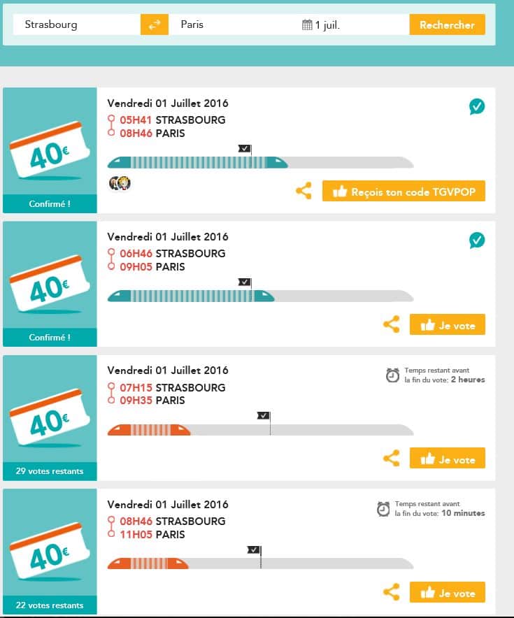 Ce service entièrement en ligne vise les jeunes (l’internaute est tutoyé sur le site) qui doivent faire « voter leurs potes » pour leur train sur les réseaux sociaux. Il permet de voyager moins cher tout en partant à la dernière minute. Et tant pis pour les personnes peu connectées. Lorsqu’un certain nombre de votes est atteint (40 pour un Strasbourg-Paris), une deuxième rame de TGV est ajoutée aux trains déjà en circulation. Les ventes sont ouvertes trois jours avant le départ, tandis que les votes sont, eux, possibles entre 15 à 4 jours avant le départ.