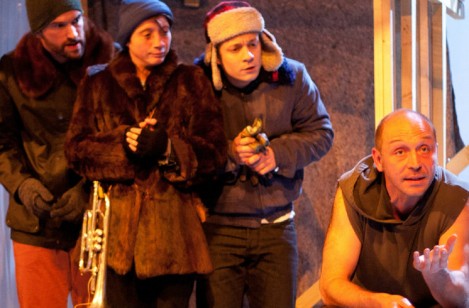 Le décor ? Un simple plateau tournant. Les costumes ? Des vêtements de tous les jours. Voilà une fanfare qui ouvre la drôle de danse de Jean la Chance, dans laquelle les onze comédiens sont tour à tour personnages ou chœur, sous l’égide d’un chef de troupe qui ne nous fera pas prendre des vessies pour des lanternes : il nous le dit, ils sont là pour nous raconter une histoire. D’ailleurs, tous regardent le public, même durant les dialogues. Pas de doute, nous sommes bien chez Brecht : on raconte plus qu’on ne joue.