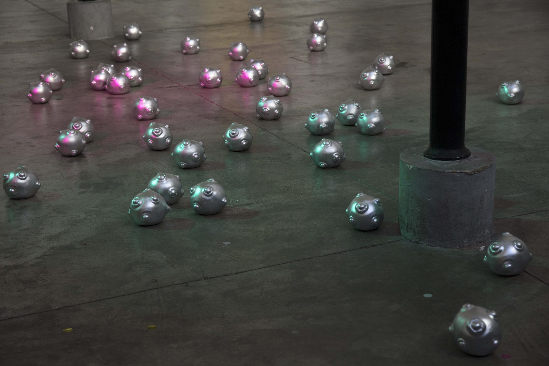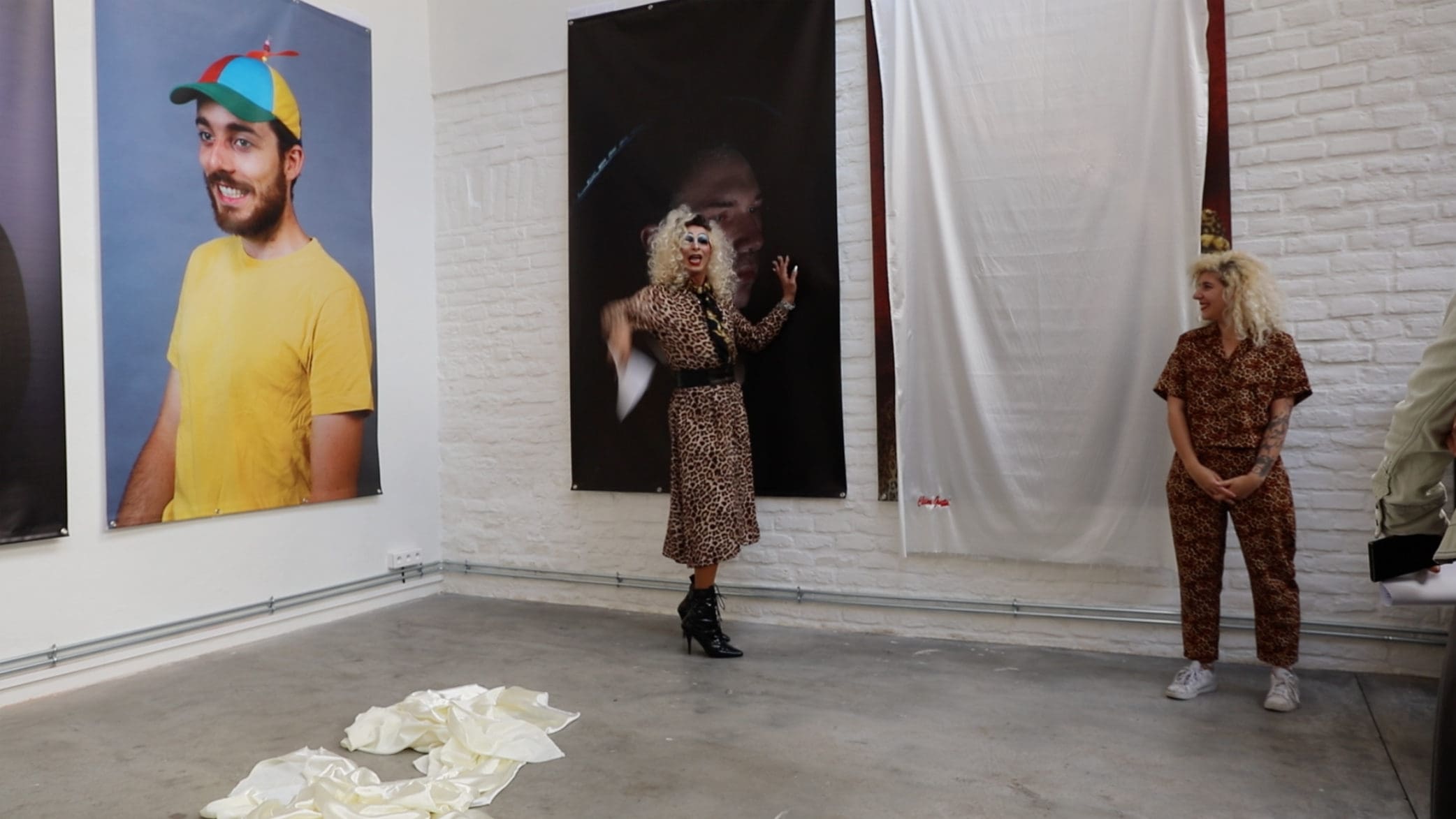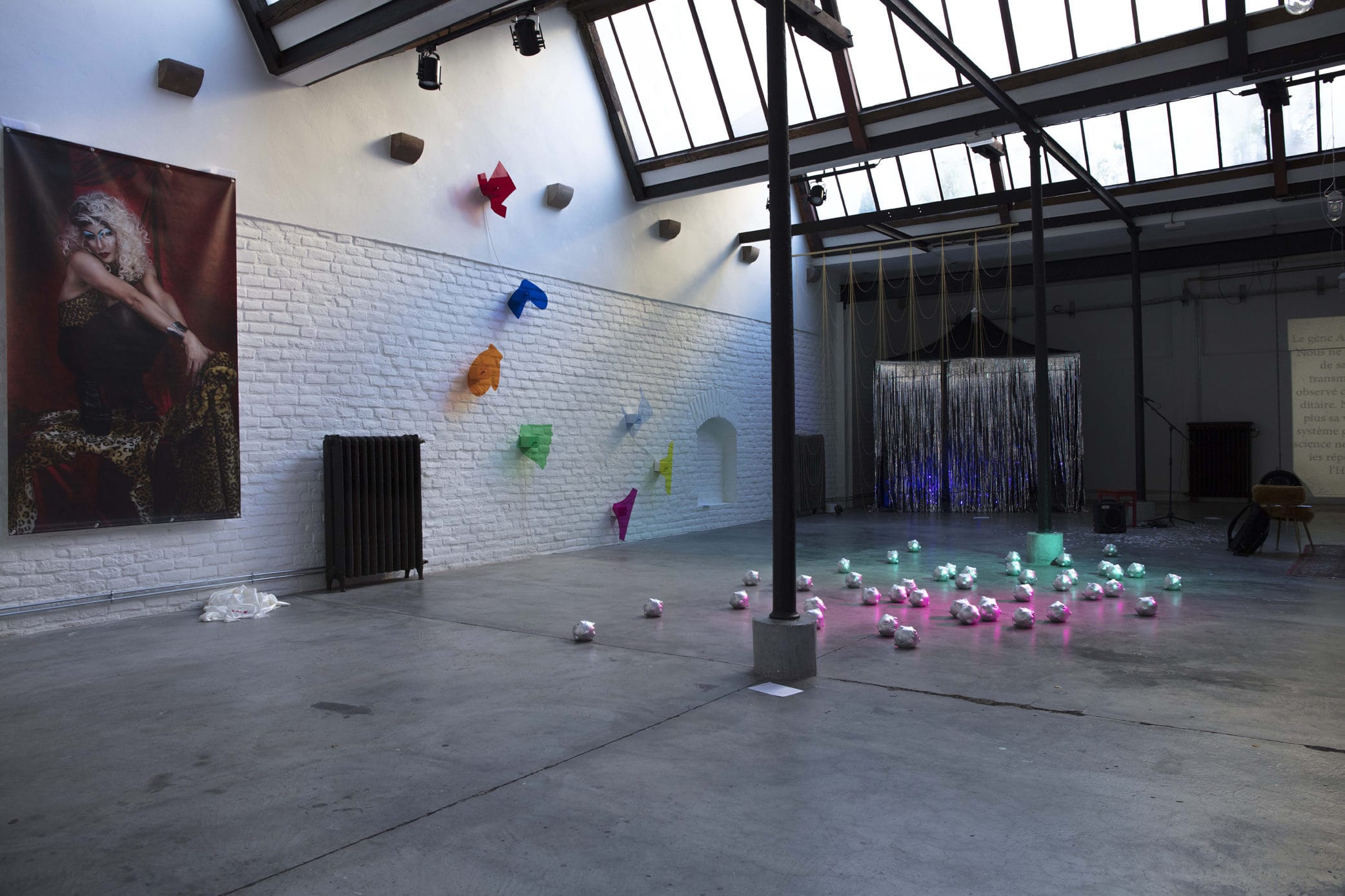 Tournant le dos à la culture d’élite, la Drag Queen Noximä Marley interprète la performance You make me feel de Claire Guetta, qui ouvre l’exposition et lui donne son caractère subversif et affranchi des normes de l’art contemporain. Entre références populaires et exploration des matières, Océan Delbes a approfondi sa recherche sur les moteurs dans l’installation Tournée collective, à travers des pièces rotatives en plastique reprenant certaines pièces vestimentaires du disco.