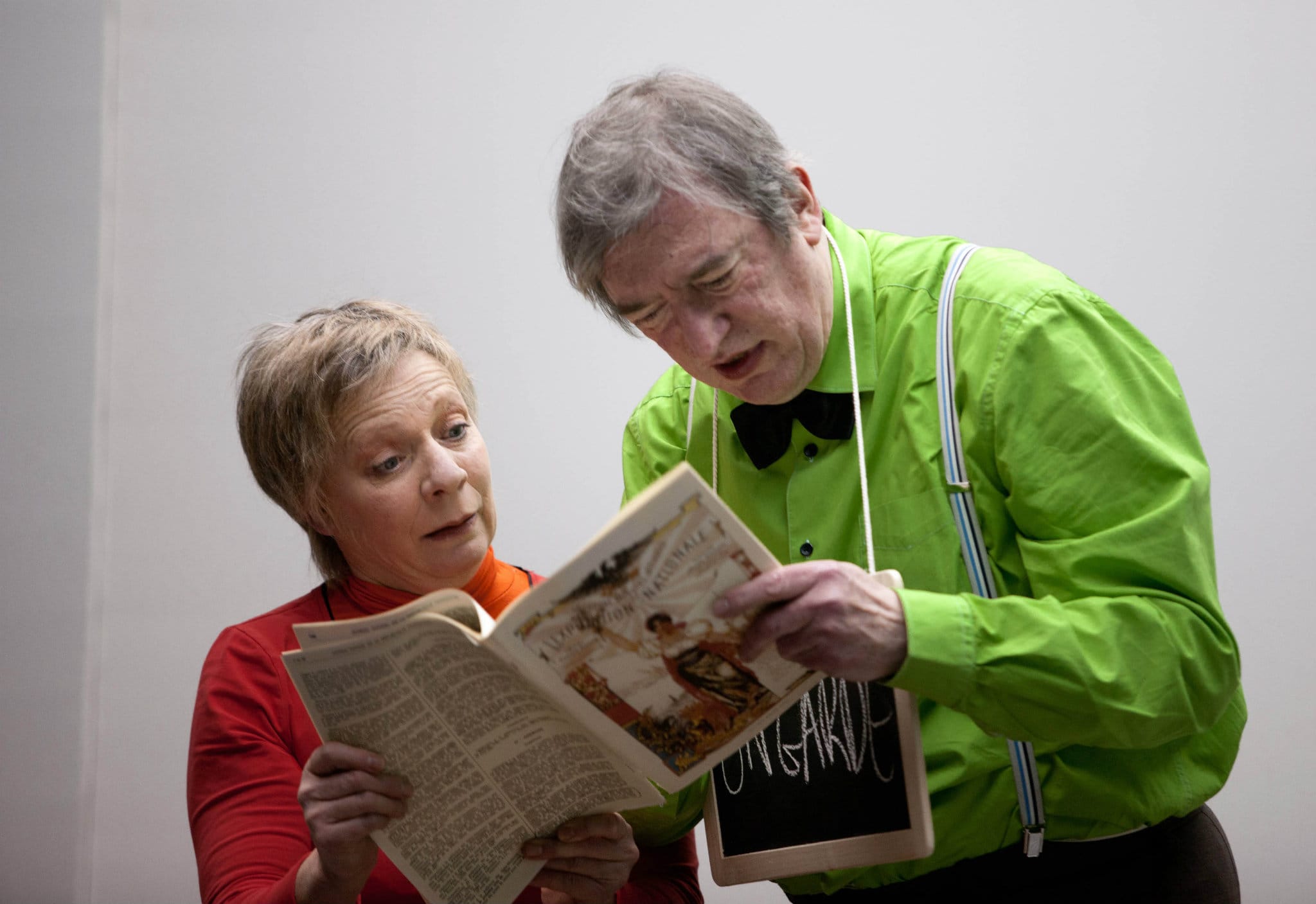 Dans cet espace tout à coup ouvert et insolemment blanc, immaculé comme un esprit qui viendrait au monde, le couple formé par Martine Schambacher et François Chattot passe avec une énergie loufoque notre histoire en revue. Les révolutions, l’art abstrait, la théorie de la propriété, tout y passe jusqu’à Nietzsche. Ni intellectualisme ni cuistrerie pourtant : nous sommes chez la ménagère de plus de cinquante ans, celle qui ne sait pas, mais qui aimerait bien savoir. Celle qui sait seulement qu’elle en a marre.