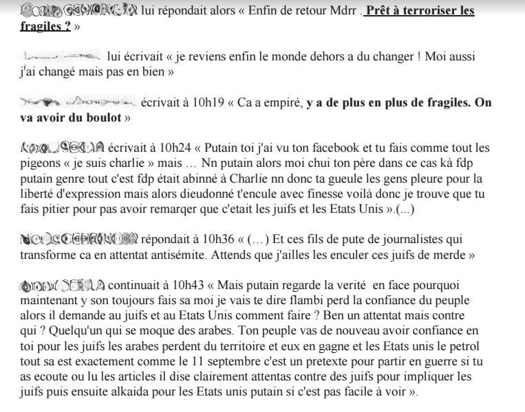 Echange en janvier 2015 entre l’un des jeunes accusés et une sixième personne après les attentats à Charlie Hebdo et l’hyper casher en janvier 2015 (extrait du rapport d’enquête / Doc Rue89 Strasbourg)