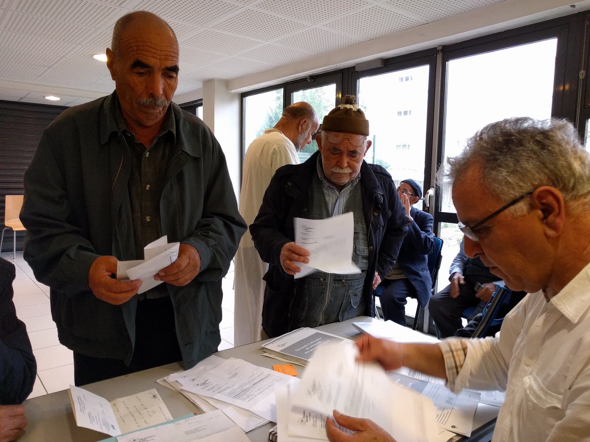 L’association qui vient en aide aux Chibanis organisait une réunion d’information en octobre. Au rez-de-chaussé du foyer de la rue de Colmar, plusieurs dizaines de Chibanis étaient présents pour confier leurs lettres d’organismes à Mustapha El Hamdani, en lui demandant de bien vouloir « régler ce problème inch’Allah ». Mustapha empile donc les courriers et démarre pour chaque cas deux procédures : une contestation, indiquant que c’est aux caisses de prouver que la personne n’est pas présente en France suffisamment longtemps, et une nouvelle demande… d’allocations, puisque que les Chibanis répondent à chaque instant à toutes les conditions pour y prétendre.