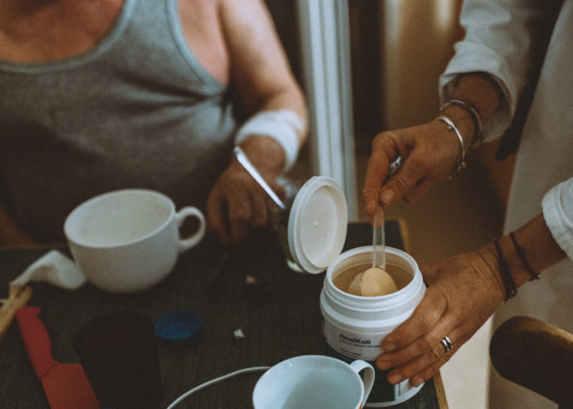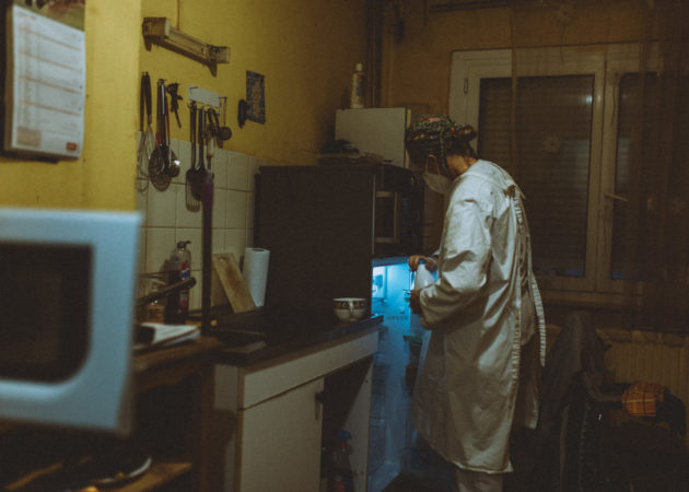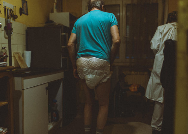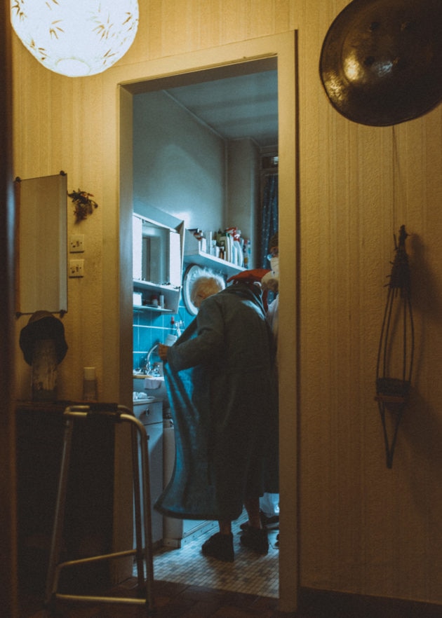 7h12, dans un bloc voisin. Élise vient réveiller Jean-Marc (le prénom a été modifié) et prendre sa glycémie. L’homme souffre de troubles cognitifs. L’infirmière s’engouffre dans la cuisine et glisse une tasse dans le micro-onde. Sans un regard pour le papier peint déchiré partout sur les murs, elle attrape une clémentine, un petit pain et découpe un kiwi. « Préparer le petit-déjeuner, ça n’entre pas dans nos attributions mais on le fait quand même », explique t-elle en aparté. Tout petit pas après l’autre, en traînant des pieds, Jean-Marc finit par arriver à table. Élise lui enfile des chaussettes aux pieds, puis un pantalon de jogging, avant de partir.