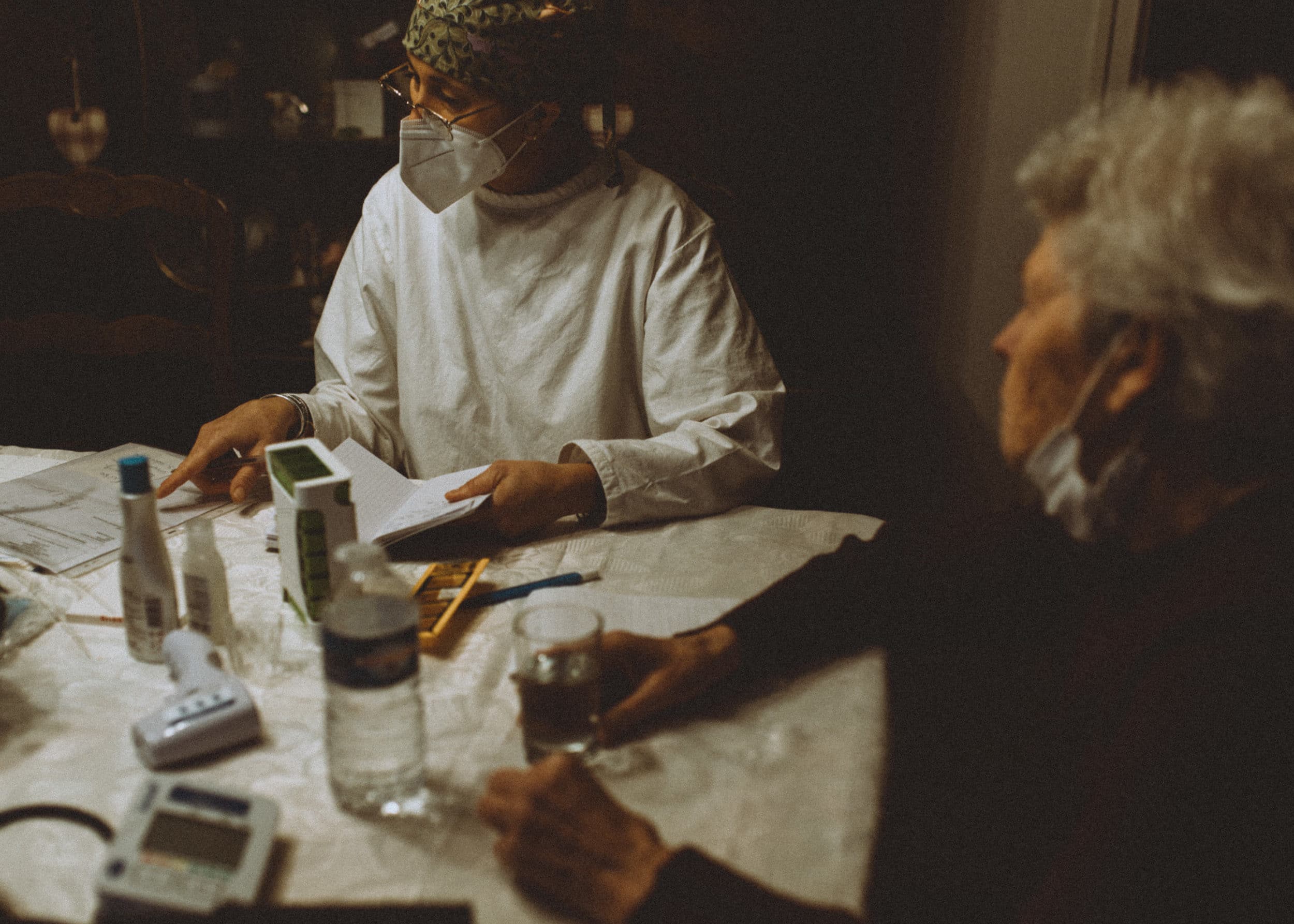 Lunettes sur le nez, l’infirmière prend le temps de parcourir son dossier de santé pendant qu’à la télévision, des journalistes dissèquent le dernier discours de Jean Castex sur une chaîne d’informations en continu. Les soins sont terminés mais Élise s’attarde pour rassurer sa patiente : « Votre examen est dans un mois. Si vous continuez à vous inquiéter comme ça, ça va être un mois d’angoisse. » Elle laisse cette dame avec une recommandation, celle de se recoucher pour faire baisser la tension.