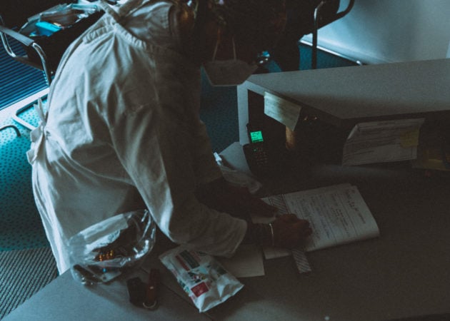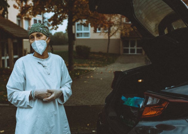 8h. L’infirmière cherche une place sur un parking rempli avant de se garer près de la porte de l’immeuble. Sur son pare-brise, pas de macaron signalant sa profession. Elle ne le met plus. « Pendant la première épidémie, il y a plein d’infirmières libérales qui se sont fait casser la bagnole et voler du matériel, » raconte t-elle. « C’est arrivé à quelqu’un que je connais. On lui a pris ses gants et ses masques. Je ne sais pas si vous vous rendez compte, » tonne-t-elle. À ce moment-là, ne plus avoir de matériel, c’était comme aller au front sans armure et sans armes ! »