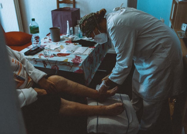 9h30, 9h47, 10h15, 10h40, 11h. Les visites s’enchaînent. Élise entre chez Claire (le prénom a été modifié) en fin de matinée pour faire des pansements. La jeune femme suit des études d’infirmière. La soignante détaille chacun de ses gestes, explique comment elle désinfecte la plaie, et quel matériel elle choisit. Enseigner, confie-t-elle, ça la tenterait bien.