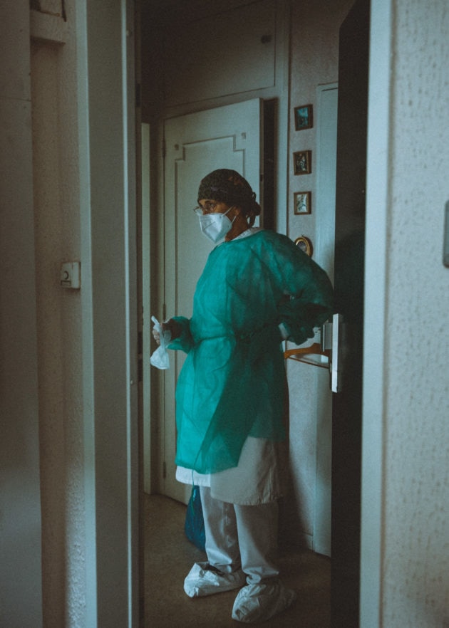 11h20. Élise s’arrête chez Marie (le prénom a été modifié), touchée par le covid il y a trois semaines. Elle a été hospitalisée. L’infirmière passe la voir depuis son retour, pour lui faire sa toilette notamment. Elle n’est plus contagieuse en théorie, mais l’infirmière sort deux surblouses de son coffre et nous les tend. Son matériel, elle l’a laissé chez Marie pour ne pas en ramener à chaque fois et faire des économies. Curieuse, la nonagénaire veut elle aussi savoir pourquoi nous sommes là. Pour suivre l’infirmière dans son travail ? Marie se lance dans une litanie entre deux essoufflements. « Madame, monsieur, sachez que je ne manque absolument de rien. Élise, elle s’occupe de tout. De tout ! Du médecin, du laboratoire, de la pharmacie. Sans elle… Je vous dis, vous pouvez vous fiez à elle ! » « Marie, garde ton souffle ! » l’interrompt Élise. Peine perdue. « Mieux, on ne trouve pas ! », poursuit Marie tandis que l’infirmière prépare son petit déjeuner. Salutations sur le perron pour enlever la surblouse et les surchaussures. « Soyez prudents et mettez bien vos masques ! » lance Marie tandis que la porte se referme.