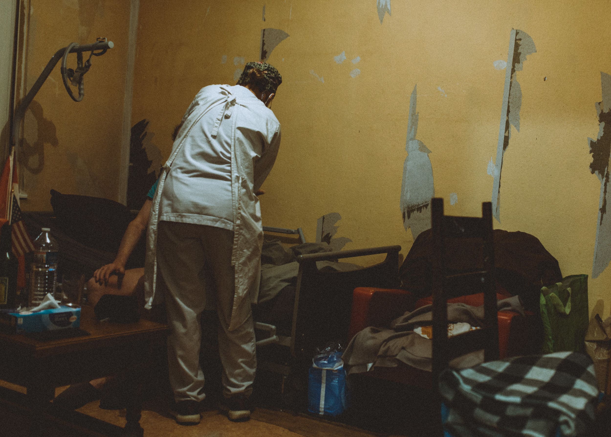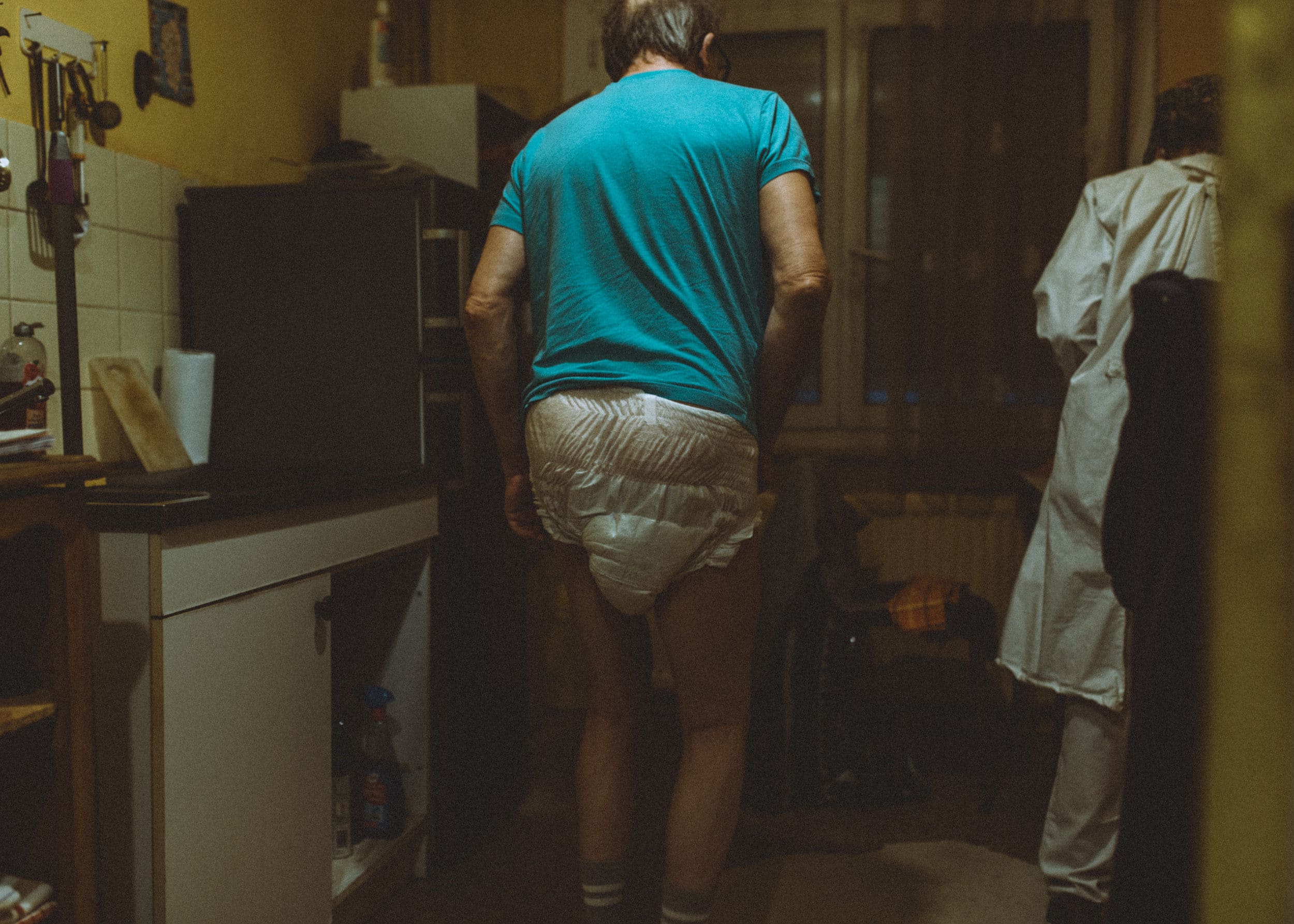 7h12, dans un bloc voisin. Élise vient réveiller Jean-Marc (le prénom a été modifié) et prendre sa glycémie. L’homme souffre de troubles cognitifs. L’infirmière s’engouffre dans la cuisine et glisse une tasse dans le micro-onde. Sans un regard pour le papier peint déchiré partout sur les murs, elle attrape une clémentine, un petit pain et découpe un kiwi. « Préparer le petit-déjeuner, ça n’entre pas dans nos attributions mais on le fait quand même », explique t-elle en aparté. Tout petit pas après l’autre, en traînant des pieds, Jean-Marc finit par arriver à table. Élise lui enfile des chaussettes aux pieds, puis un pantalon de jogging, avant de partir.