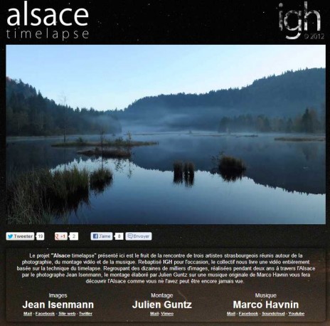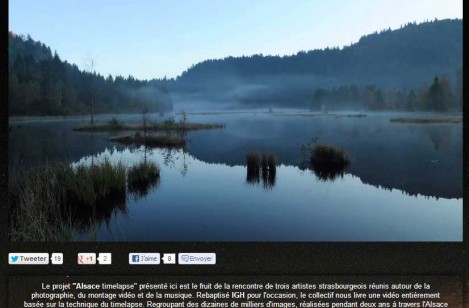 Trois artistes strasbourgeois, le photographe Jean Isenmann, le monteur vidéo Julien Guntz et le musicien Marco Havnin, ont réalisé un clip sur l’Alsace et Strasbourg de 4mn12, tout en « timelapse ». Cette technique consiste à prendre des milliers de clichés d’une même scène à intervalles réguliers, et à en sélectionner quelques uns pour créer une vidéo. Si la vidéo est en 25 images par secondes, et qu’une image a été prise toutes les secondes, l’effet produit consiste à accélérer le temps 25 fois.