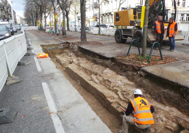 Sur une autre zone du tracé surveillé par les archéologues, ce sont des vestiges de l’enceinte médiévale de Strasbourg qui sont retrouvés. Puis, boulevard de Nancy, Pascal Flotté prévoit de tomber sur un rempart du XIVe siècle.