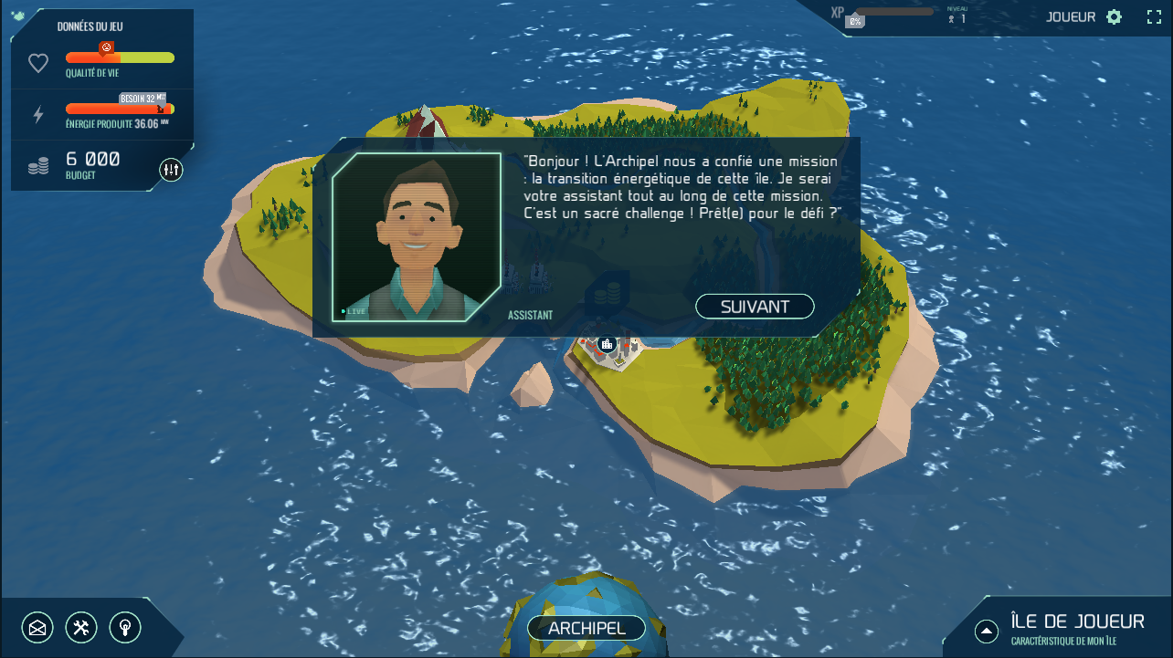 Ce jeu en 3D qui se joue dans le navigateur (mais qui nécessite un complément, Unity Web engine, qui ne fonctionne pas sur Chrome) ou sur les smartphones et tablettes propose aux utilisateurs d’utiliser l’énergie des vagues, du vent, du soleil et même de la terre, sans augmenter les impôts si possible ni dégrader le cadre de vie des habitants et sans puiser dans les ressources naturelles. Donc installer une éolienne, oui mais pas près des villes, ni près des arbres, etc.
