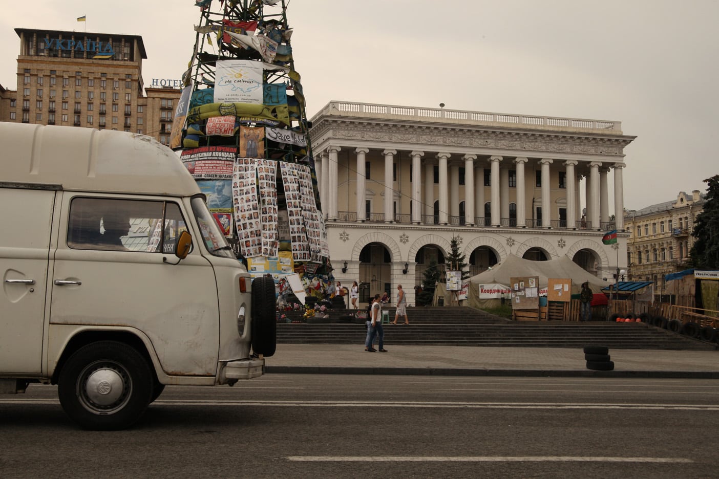 La place Maïdan ressemble à un champ de bataille. Les barricades, les tentes et tout le matériel des combats de cet hiver sont restés à leur place. Ivan, qui avait pris part aux manifestations de cet hiver, raconte :
