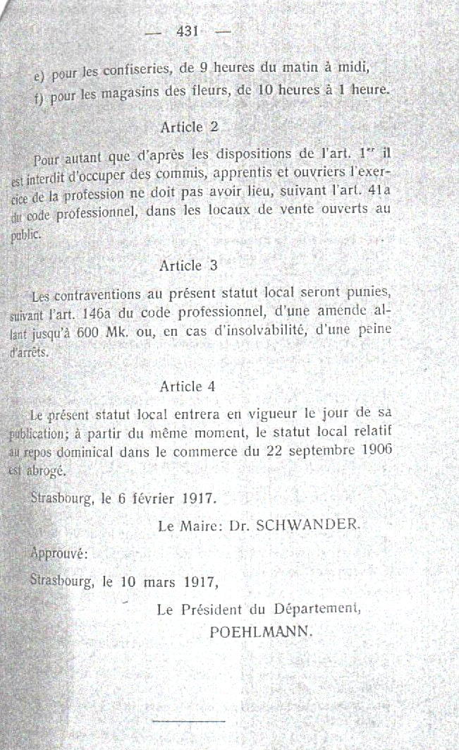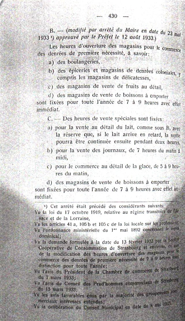 « Dans le commerce, il est interdit, sauf les exceptions admises par les autorités compétentes, d’occuper les commis, apprentis, ouvriers, les dimanches et les jours fériés : dans les banques, agences, entreprises de transport, maisons de gros et autres bureaux du commerce, y compris les magasins de tabac et cigares, à part les exceptions citées ci-après. «