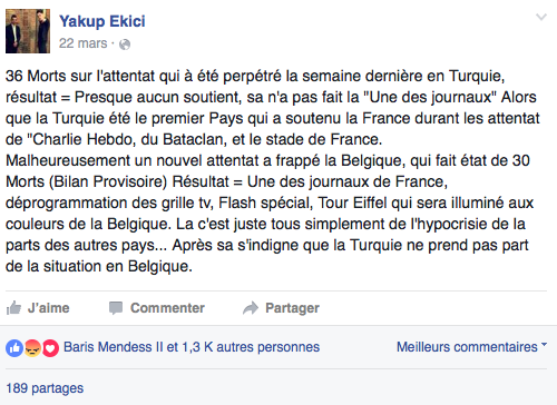 Quant à Yakup, comme il est de plus en plus suivi sur les réseaux sociaux, il estime faire « de plus en plus attention » à ce qu’il publie. Ce qui ne l’empêche pas de continuer à commenter l’actualité, comme il l’a fait au cours des derniers mois après les attentats d’Ankara et de Bruxelles, les violences entre policiers et manifestants à Strasbourg… Et parfois en faisant référence à sa religion, comme après les attentats d’Ankara de juin.