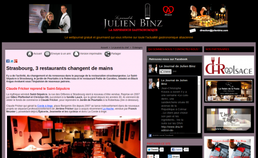 Le journal en ligne de Julien Binz récapitule les récents changements intervenus au sein des propriétaires de trois restaurants strasbourgeois. Le vient d’être cédé à Claude Fricker. Pas de révolution prévue pour la carte par l’ancien cogérant de la Corde à Linge, mais quelques travaux au programme avant de rouvrir le 1er mars 2013. L’ancien propriétaire de l’établissement, Gilles Pfaffenhof, s’éloigne du centre-ville et acquiert le Jardin de Pourtalès. De son côté, Najib Ben el Maleki reprend Poêles de carottes pour le transformer en « repères à carnivores ». Renommé Black Angus, l’établissement propose désormais diverses viandes grillées.