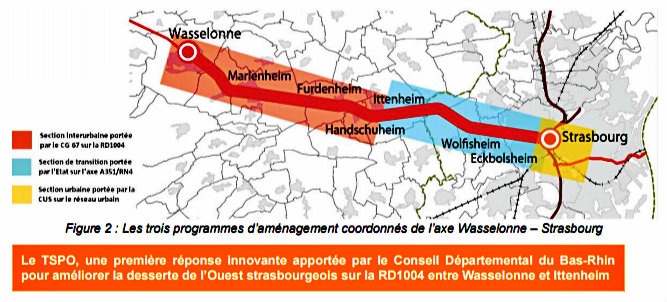 Il répond à l’acronyme de TSPO, pour Transport en site propre de l’ouest strasbourgeois. Comprenez une route où seuls les cars peuvent circuler pour se déplacer plus vite et garantir le temps de trajet, la version campagnarde des bus à haut niveau de service (BHNS) comme la ligne G qui dessert l’espace européen de l’entreprise à Schiltigheim.