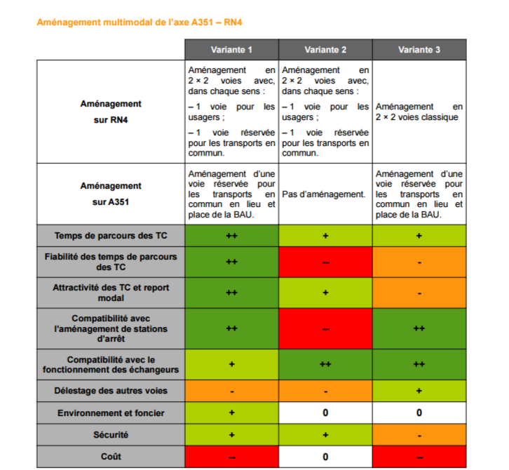 « Les congestions actuellement constatées sur l’axe A351 – RN4 vont se poursuivre. […] La mise en service du GCO rendra nécessaire la mise à 2 × 2 voies de la RN4, qui redeviendra alors fluide. »