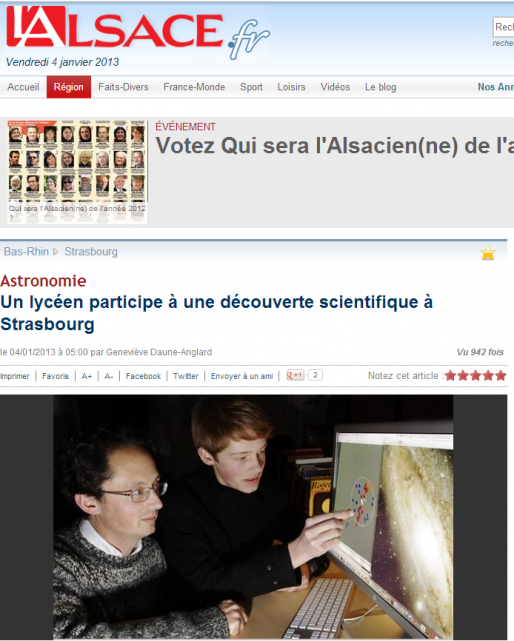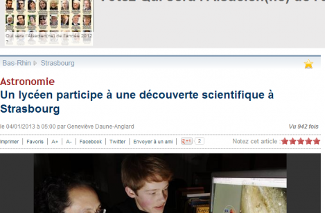E=MC2. On n’en est plus si sûr ! Un lycéen strasbourgeois de quinze ans, Neil Ibata , remet en question les théories d’Einstein en seulement deux jours. Accompagné de son père chercheur au CNRS et d’une équipe de scientifiques internationale, Neil a découvert que les formations naines autour de la galaxie Andromède ne se déplacent pas de manière aléatoire mais tournent sur une sorte de disque géant. Découverte qui peut paraître mineure au commun des mortels mais qui vaut quand même à ce jeune prodige de faire la couverture du magazine Nature.
