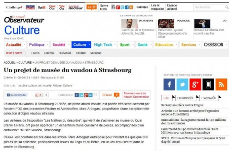 Tiens donc ?! Ce musée serait-il comme son sujet réservé aux seuls initiés ? Selon Le Nouvel Observateur qui reprend une dépêche AFP (voir également sur les DNA), Marc Arbogast entrepose pour l’instant les quelque 830 pièces de sa collection, principalement issues du Togo et du Bénin, en un lieu tenu secret dans le centre de Strasbourg.