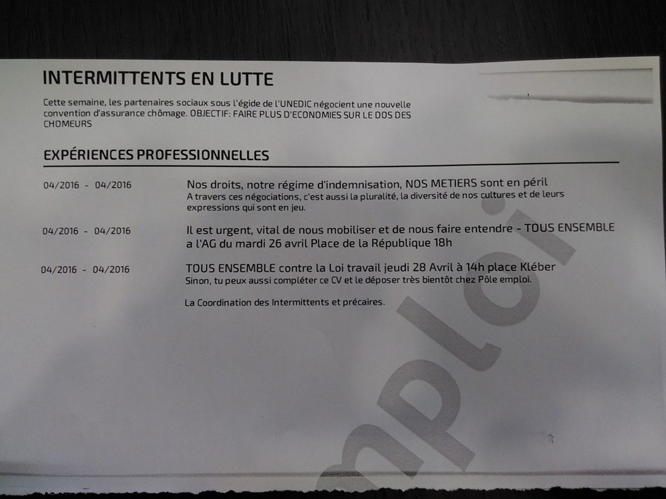 Lundi après-midi, le petit groupe de manifestants est allé distribuer des tracts au siège social d’Arte. Fayssal Benbahmed a profité de sa présence à Pôle emploi pour écrire et imprimer un tract sur un des ordinateurs. « C’est du matériel acheté avec notre argent en fait », ironise-t-il. Mais la seule application disponible est destinée à créer des CV avec le filigrane de Pôle emploi, ce qui donne un tract assez original :