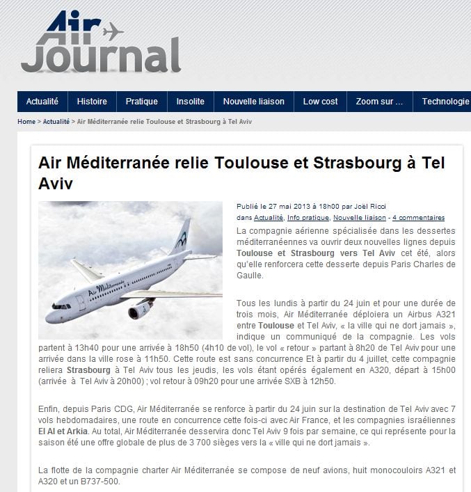A partir du 4 juillet, Air Méditerranée reliera Strasbourg à Tel Aviv tous les jeudis, les vols étant opérés également en A320, départ à 15h00 (arrivée à Tel Aviv à 20h00) ; vol retour à 09h20 pour une arrivée à Strasbourg à 12h50.