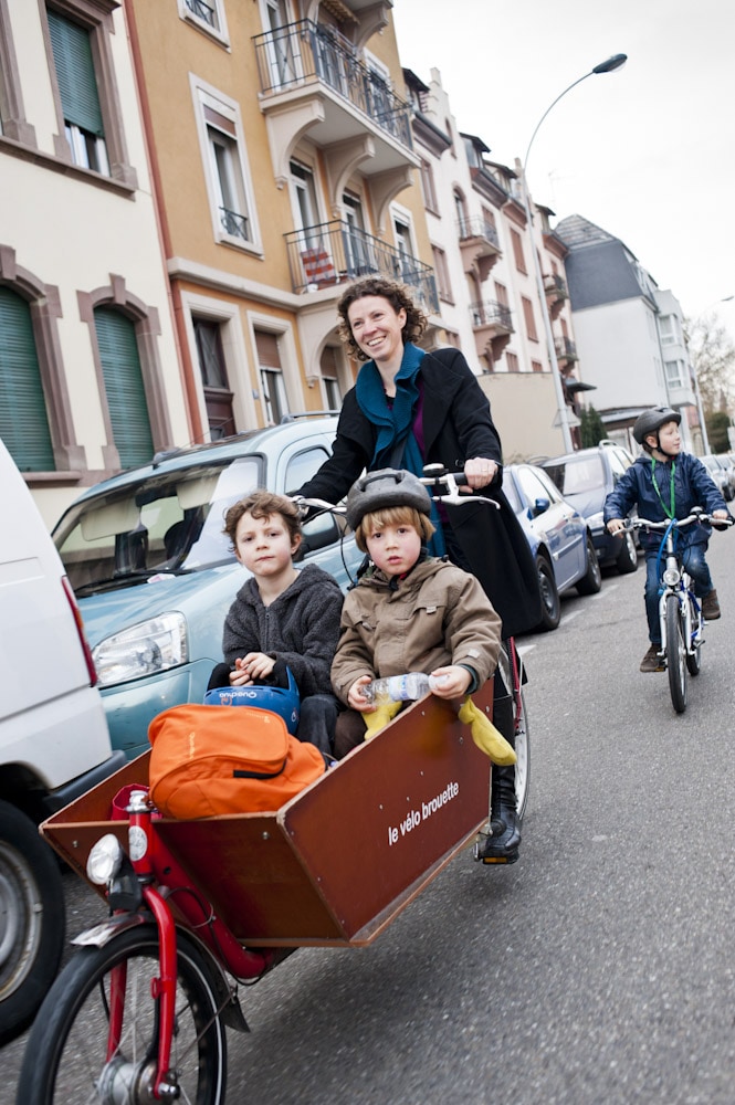 On a alors acheté une carriole qui s’accroche à l’arrière du vélo, mais on a détesté. On ne pouvait pas surveiller les enfants (des garçons !) et niveau maniabilité, je n’étais pas à l’aise… Un sentiment d’insécurité qui nous a poussé à nous en débarrasser au bout de six mois. Et puis un jour, on a rencontré une maman au parc de la Meinau qui avait un vélo cargo Bakfiets. Elle était allée le chercher en camionnette aux Pays-Bas. A l’époque, il n’était pas importé ailleurs qu’à Lyon… où nous sommes allés chercher le nôtre ! »