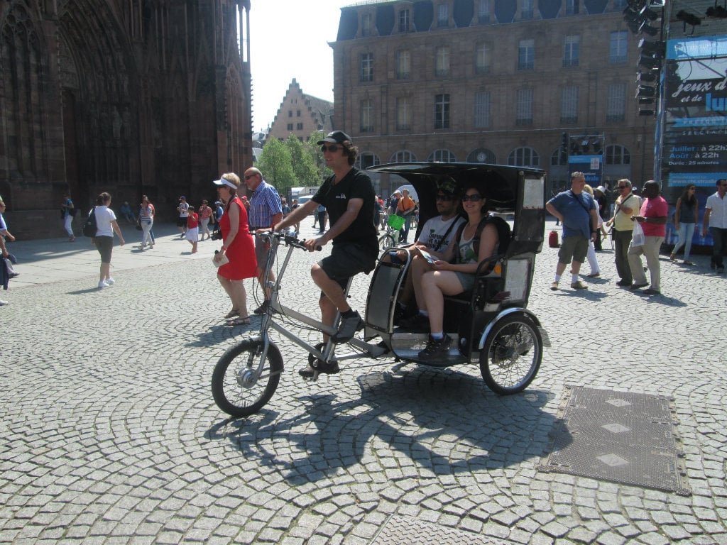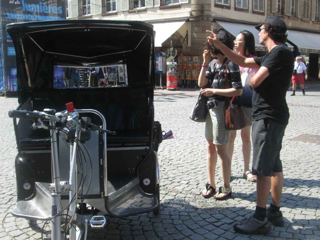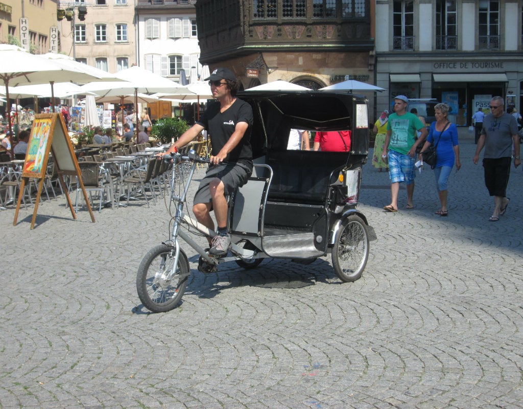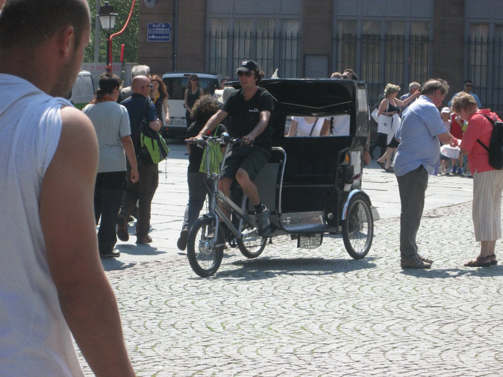 Pari réussi ce matin pour Jean-Charles Muller. Un couple de touristes aimerait être déposé place Kléber. Le trajet est court mais quelques minutes plus tard, il revient avec à l’arrière de son vélo, deux autres touristes allemands qui souhaitaient justement visiter la cathédrale. A peine déposés, les Jean-Charles reprend le guidon, et ainsi de suite jusqu’au coucher du soleil :