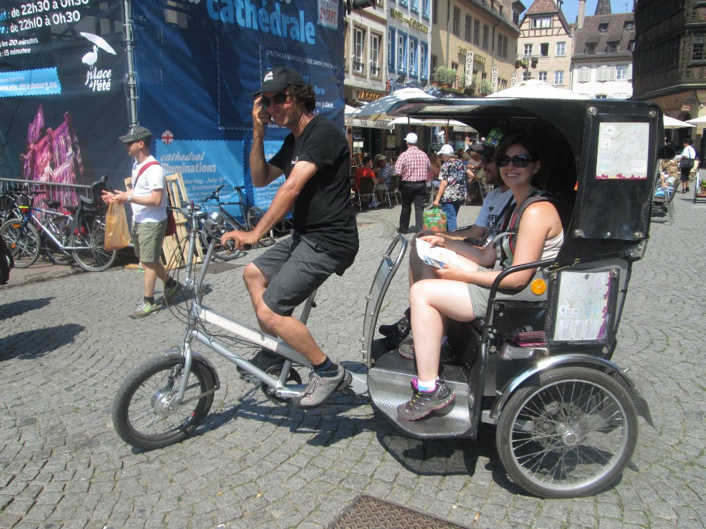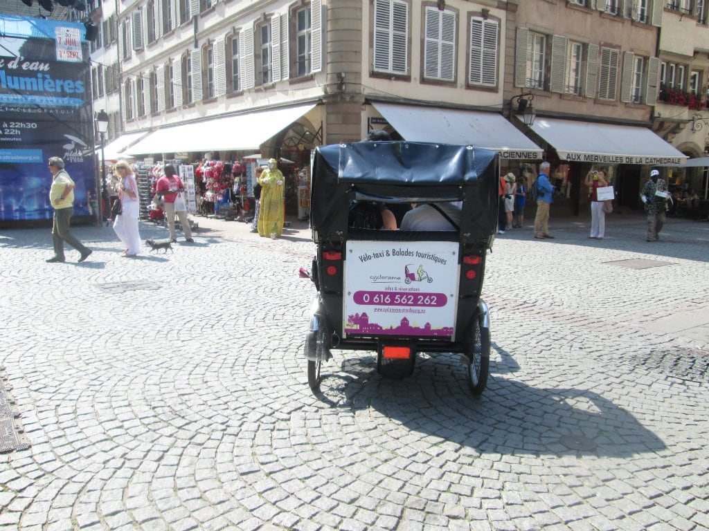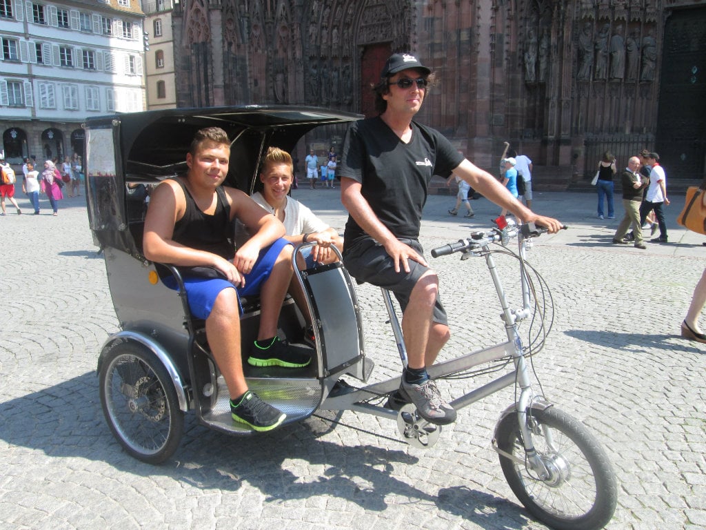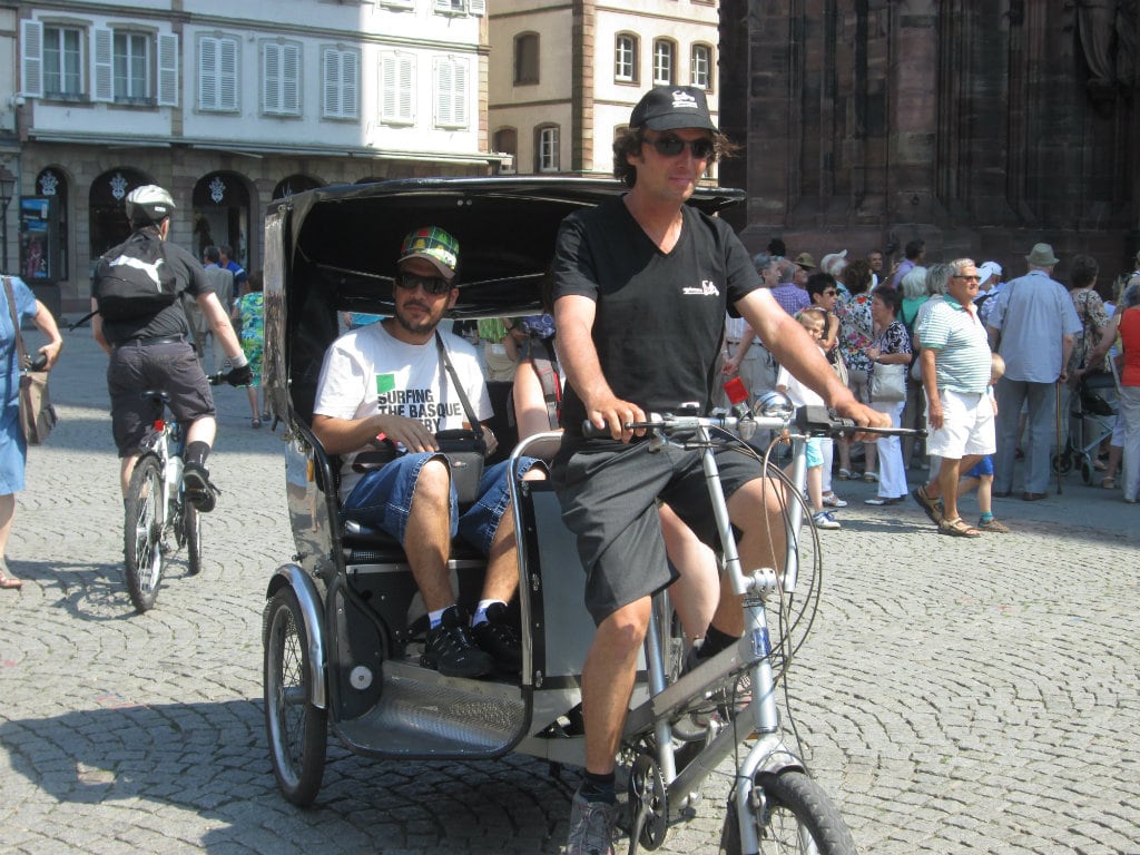 Pari réussi ce matin pour Jean-Charles Muller. Un couple de touristes aimerait être déposé place Kléber. Le trajet est court mais quelques minutes plus tard, il revient avec à l’arrière de son vélo, deux autres touristes allemands qui souhaitaient justement visiter la cathédrale. A peine déposés, les Jean-Charles reprend le guidon, et ainsi de suite jusqu’au coucher du soleil :