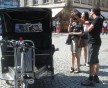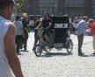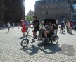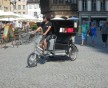11h, parvis de la cathédrale à Strasbourg. Jean-Charles Muller vient de terminer sa première course en vélo-calèche de la journée. Un couple de touristes allemands a réservé la veille pour une balade de 30 min en fin de matinée ce mercredi 10 juillet au centre-ville. C’est avec un large sourire qu’il regagne son coin stratégique sur la place, en se faufilant entre les touristes à la recherche de nouveaux passagers.