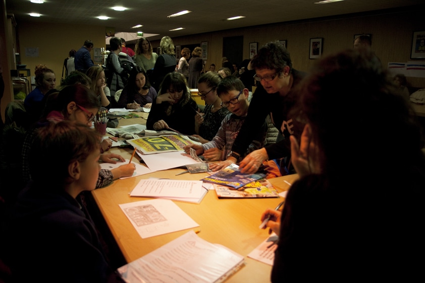 Des tables ont été installées près du bar. Mais il faut modifier l’espace : pas assez de place pour accueillir la cinquantaine de visiteurs du soir, dont une bonne moitié d’enfants. Ils arrivent à 18 heures, s’installent, sortent les crayons et se lâchent. À écouter Stéphane Litolff, directeur de l’espace culturel de Vendenheim, les choses se sont un peu précipitées, ces derniers jours.