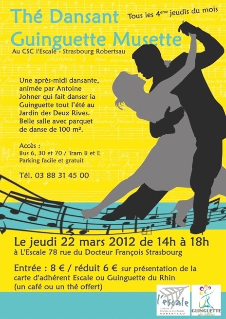 Ce thé dansant est animé par Antoine JOHNER qui fait déjà danser la Guinguette tout l’été au Jardin des Deux Rives. La grande salle de l’Escale accueillera les danseurs sur son parquet de 100 m².