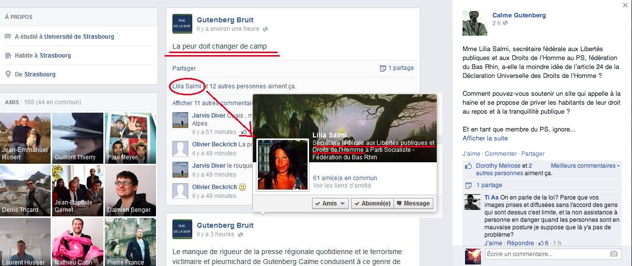 Mais Calme Gutenberg ne se contente pas de poster des vidéos de jeunes éméchés sur Internet, ses membres traquent la moindre activité des élus et des acteurs strasbourgeois sur les réseaux sociaux. Ainsi lorsqu’un profil Gutenberg Bruit a été créé début août, Lilia Salmi, secrétaire fédérale aux Libertés publiques et Droits de l’homme au PS du Bas-Rhin, s’est vue dénoncée auprès des quelque 200 fans de Calme Gutenberg pour avoir osé « liker » un post…